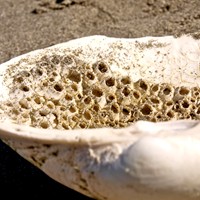 Barnacle covered clam shell in Port Ludlow, Washington